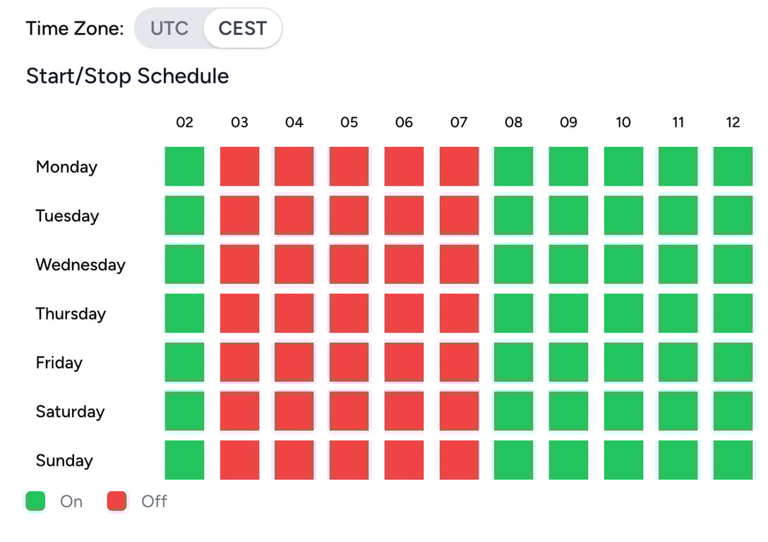 Test servers don't need to be online at 3am. Manually schedule instances with our visual time grid.