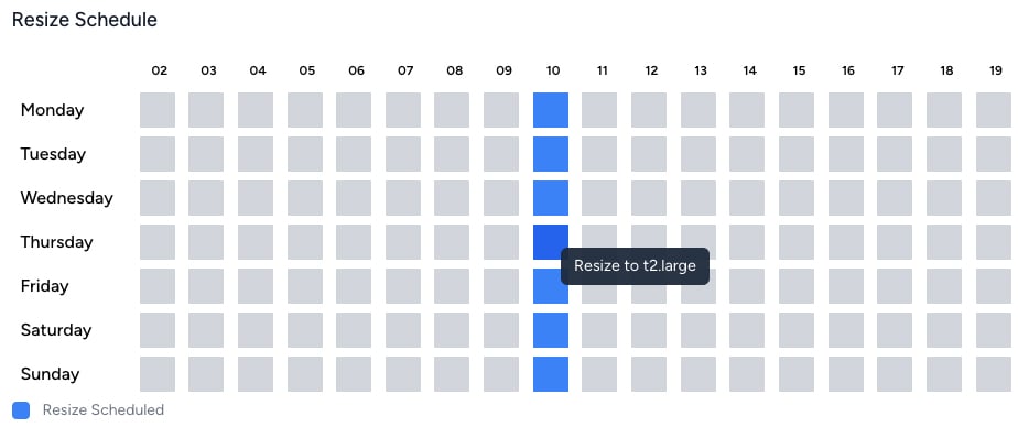 Server Scheduler provides a visual time grid to automatically resize EC2 instances at scheduled times throughout the week.